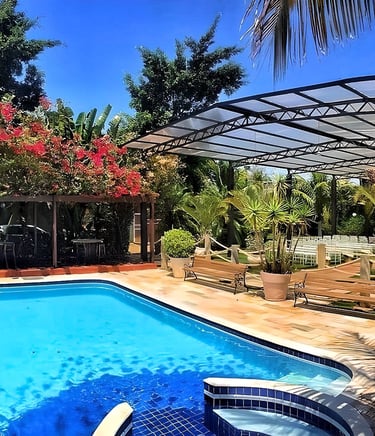 Desfrute de momentos de descontração e relaxamento em nosso magnífico espaço externo, completo com uma piscina deslumbrante e um gramado coberto com telhas transparentes - o cenário perfeito para uma cerimônia ao ar livre mágica e única.